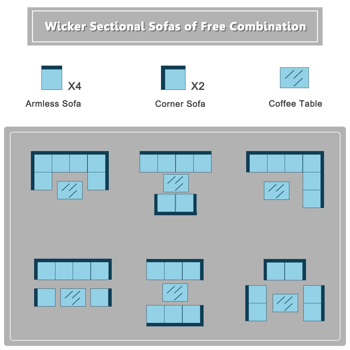 ● Free Combination of Sectional Sofa: Comes with four armless sofas two corner sofa and a coffee table this patio furniture can be flexible in combination according to your needs and based on your room space. In addition 10 clips secure the sofa firmly together to avoid sliding. The patio furniture set with ample seats allows you to relax with your friends.
