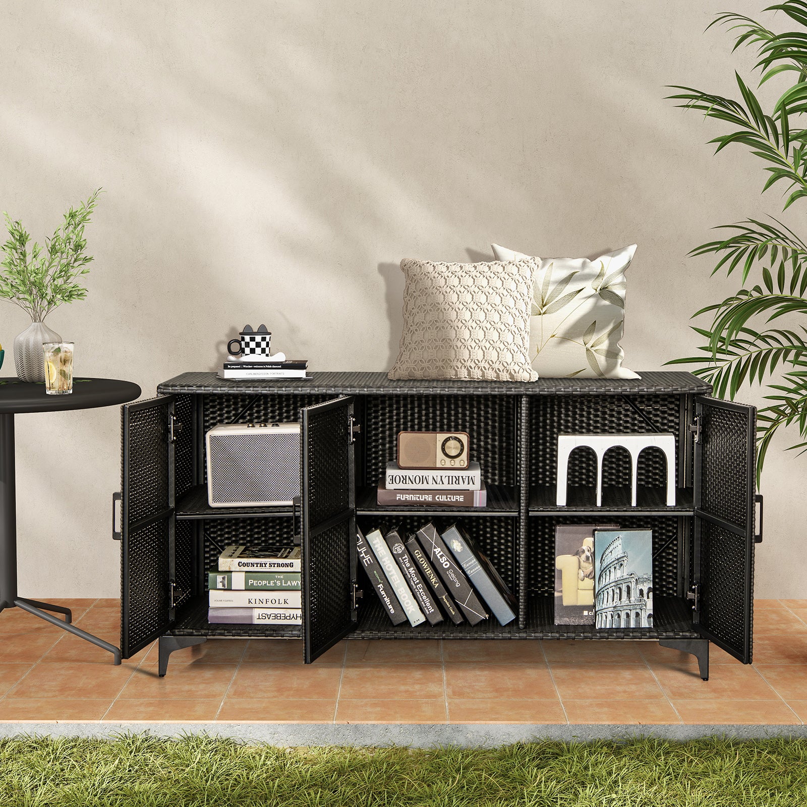 84 Gallon Patio Wicker Deck Box 3-Door PE Rattan Storage Container with Removable Shelves-Black