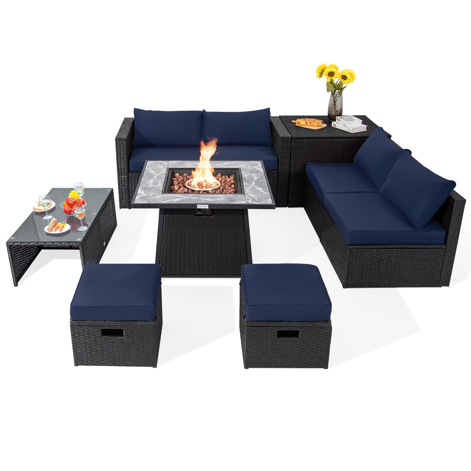 9 Pieces Outdoor Wicker Sectional with 35 Inch Gas Fire Pit Table-Navy