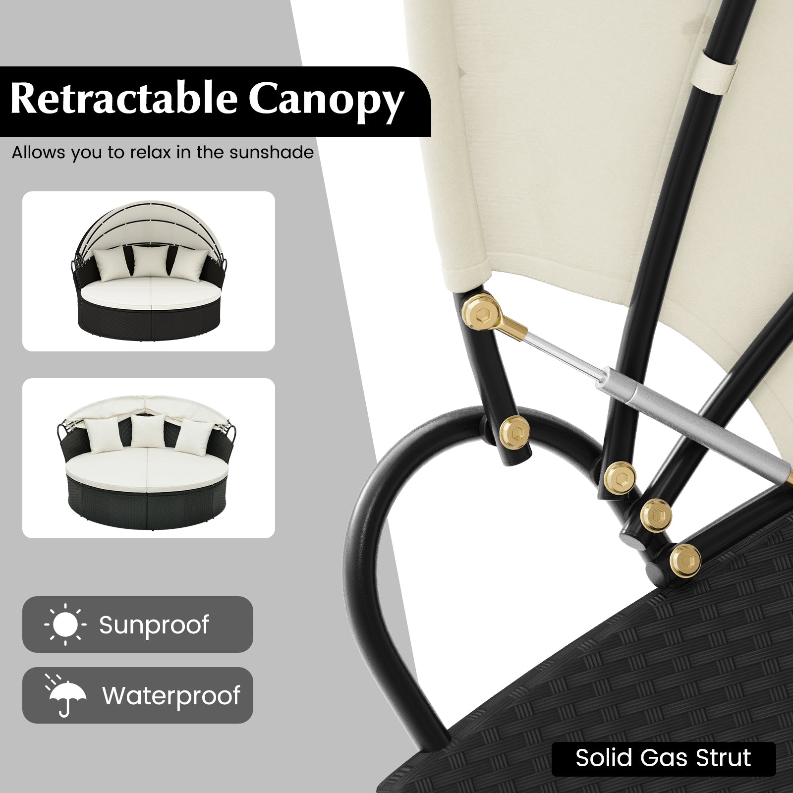 Clamshell Patio Round Daybed Wicker with Retractable Canopy and Pillows-Off White