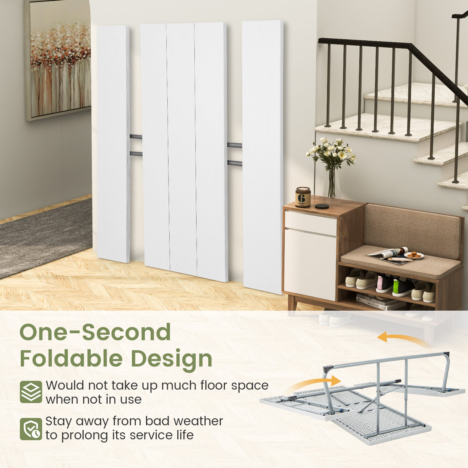 ● One-Second Foldable Design: The picnic table set is incredibly convenient to fold into a flat size in 1 second which would not take up much floor space when not in use. It can also be a good way to stay away from bad weather to prolong its service life.