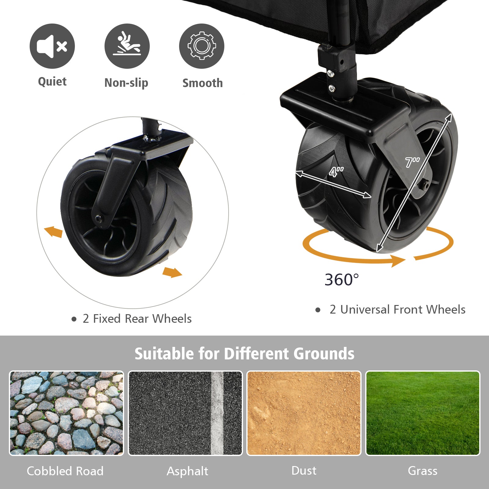 ● Wide All-Terrain Wheels: The collapsible wagon come with heavy duty 7"x 4" thick wide solid wheels. 2 universal front wheels and 2 directional rear wheels can move to every direction you want to go easily it's suitable for various road surfaces like the cobbled road asphalt dust and grass.