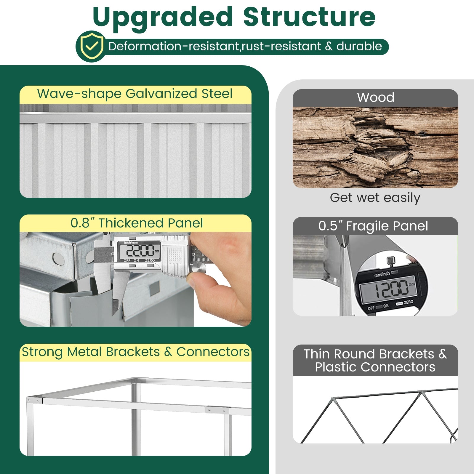 ● Galvanized Steel Construction: Constructed of 6mm thickened rustproof galvanized frame the raised garden bed is super sturdy and durable for long service life. And it's surface adopts wave-shape design to enhance deformation resistance. Moreover the extended edges of the greenhouse allow you to add weighted items to resist wind.