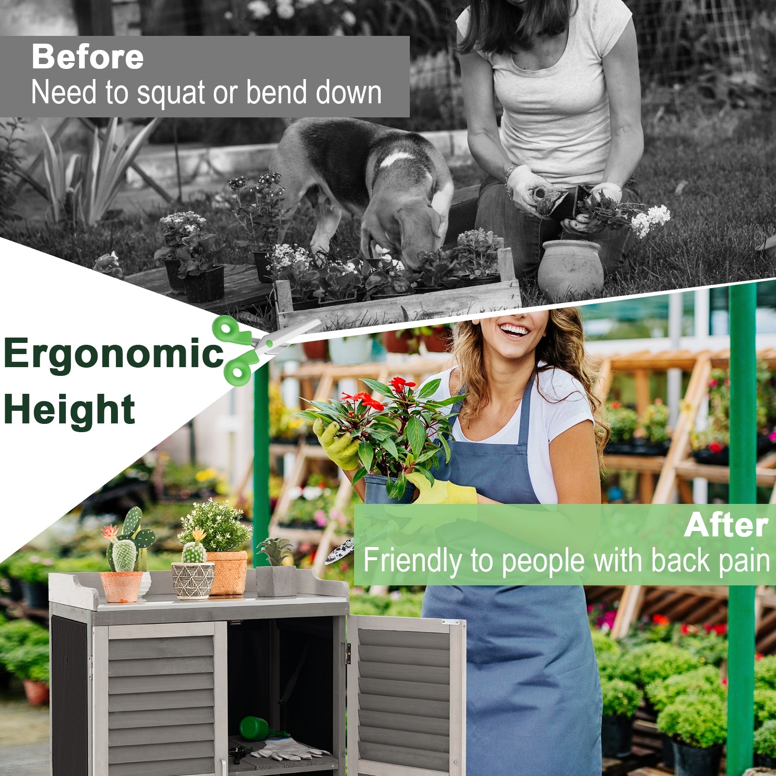 ● Ergonomic Height and Wide Use: Designed with a reasonable height you don't need to squat down or bend down to work. So if you had back pain before the garden shed will be a wise choice. Besides the garden planting table had maximize the space utilization to complement your garden porch lawn etc.