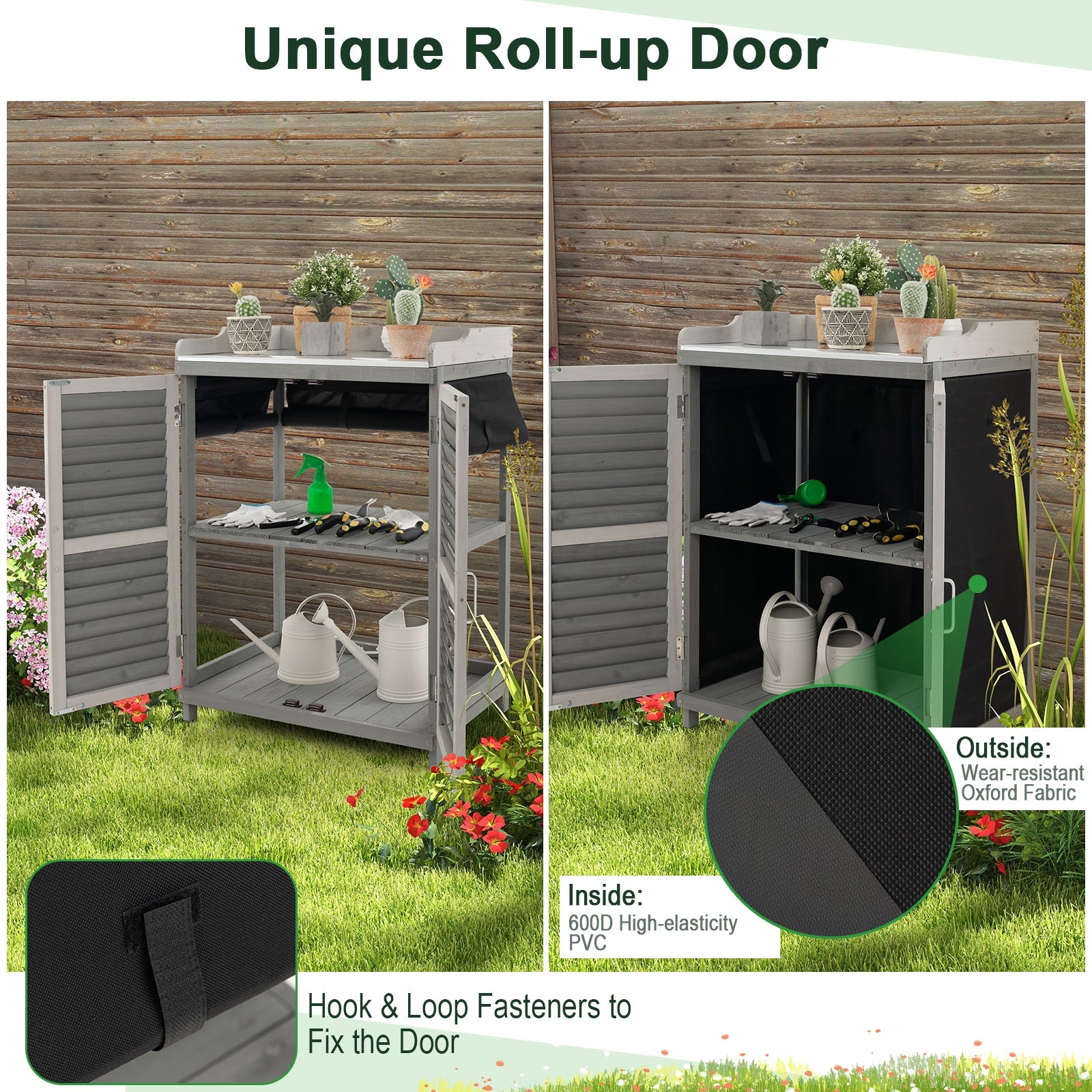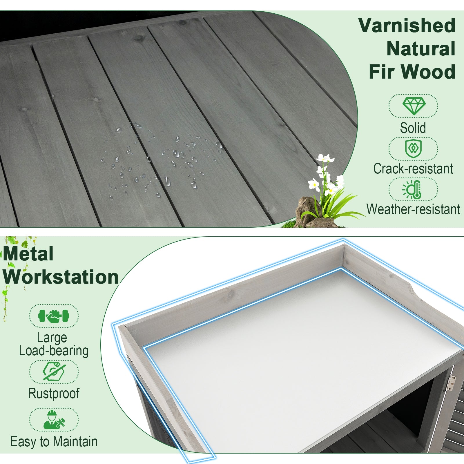 ● Solid and Durable Wood Frame: The wooden garden workstation is constructed of selected fir wood which is known for its high hardness and excellent crack-resistance. In addition it is painted with odorless varnish to endure outdoor weather conditions thus ensuring long companionship.