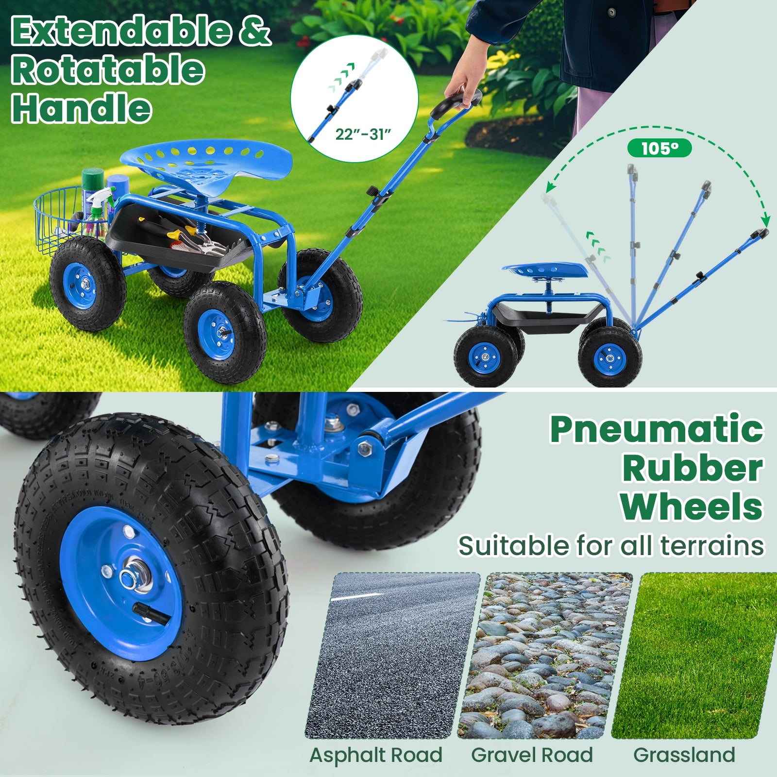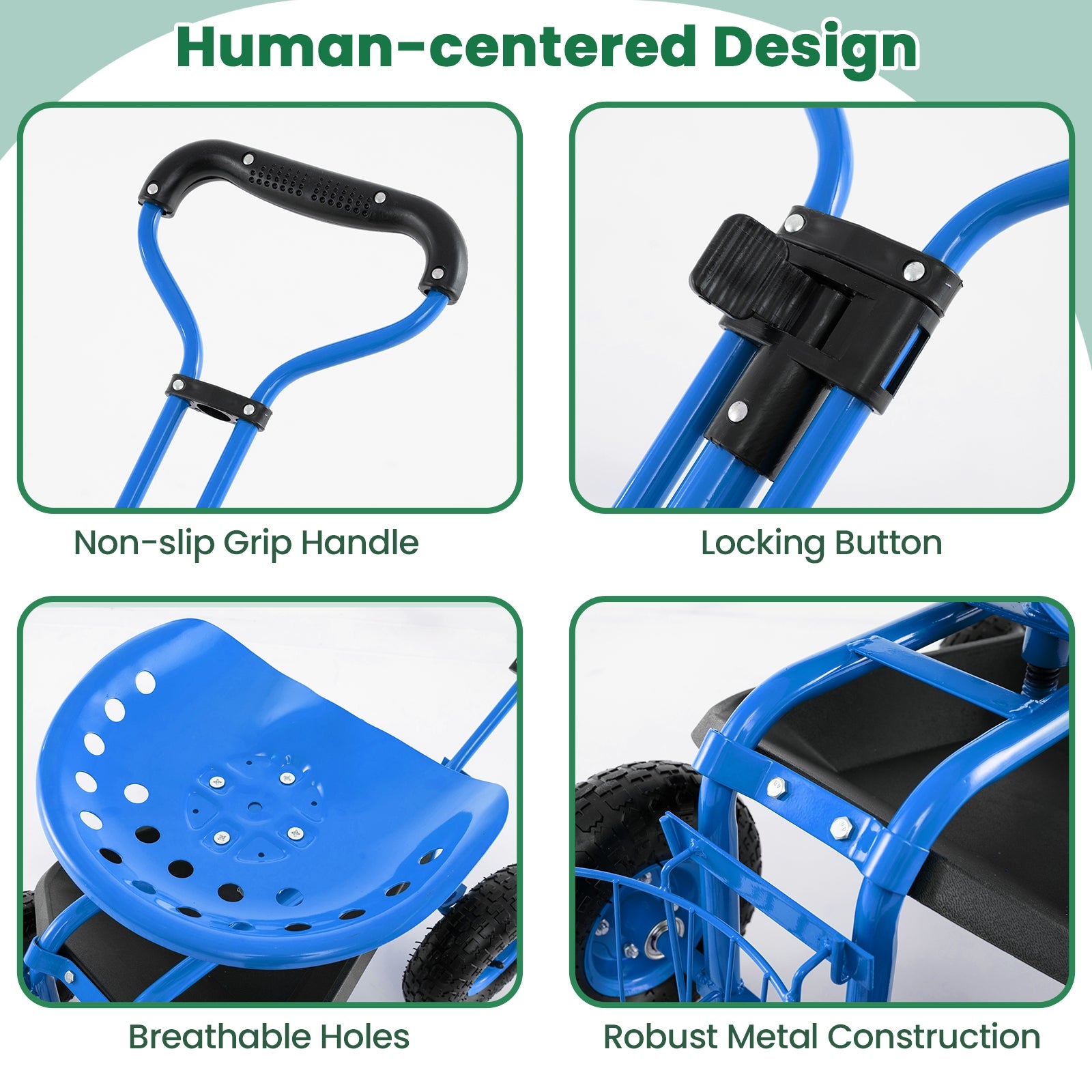 Heavy Duty Garden Cart with Tool Tray and 360 Swivel Seat-Blue