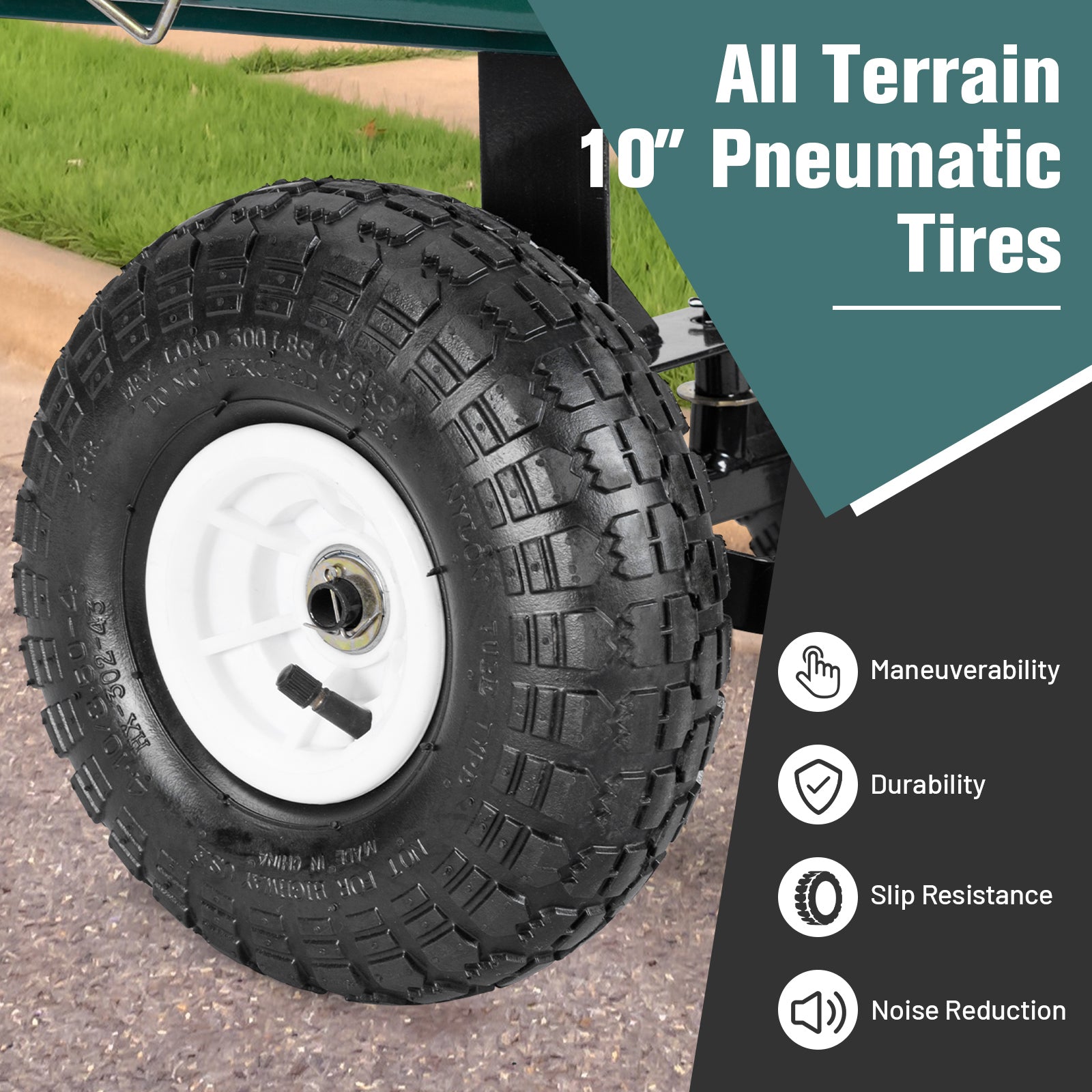 ● Comes with durable 10-inches diameter air-filled rubber wheels to absorb shock and make sure roll easily over rough terrain