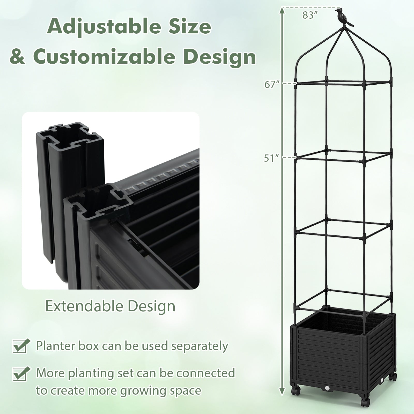 ● The garden box with trellis has 3 adjustable heights of 83" 67" 5"