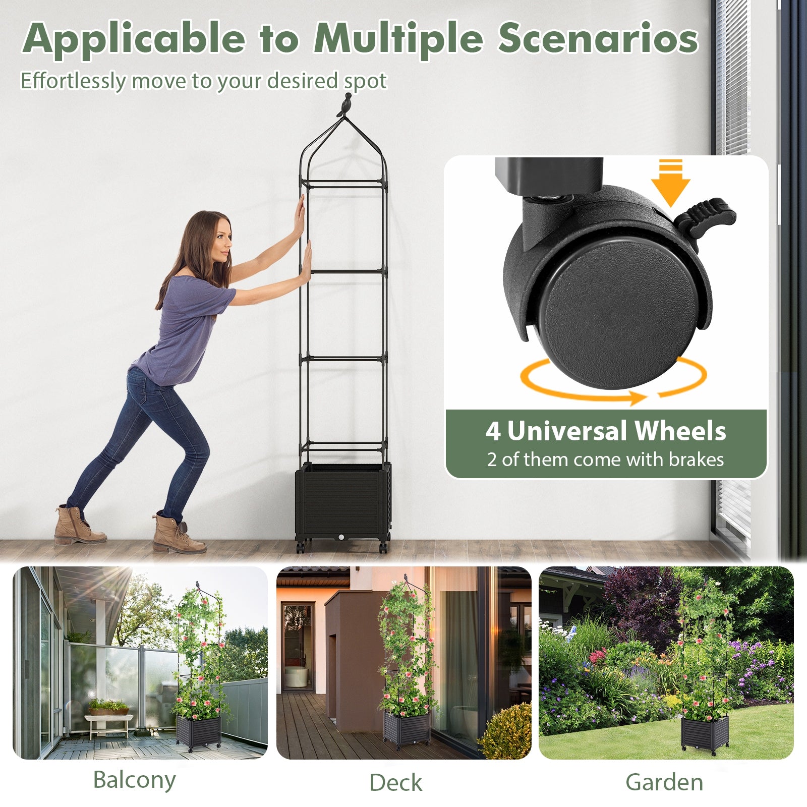 ● Free Mobility for Wide Usage: Equipped with 4universal wheels the garden box with trellis can be effortlessly moved to your garden patio balcony or yard. Besides 2 of the wheels are lockable to keep the planter securely in place wherever desired. As the arch top features bird sculptural the tomato planter box is a centerpiece in your garden.