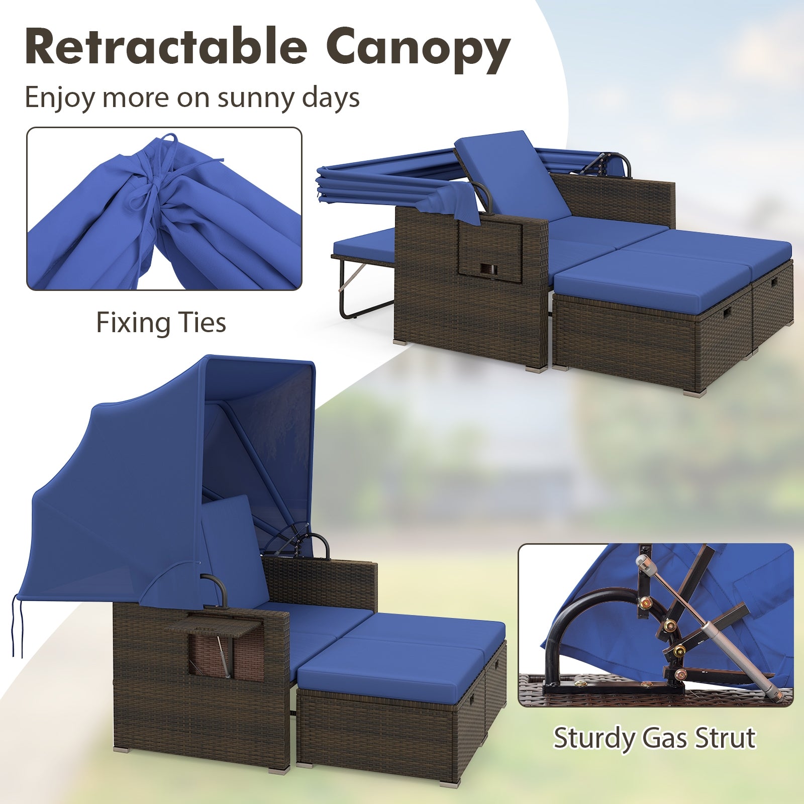 Outdoor Patio Rattan Daybed with Retractable Canopy and Adjustable Backrests-Navy