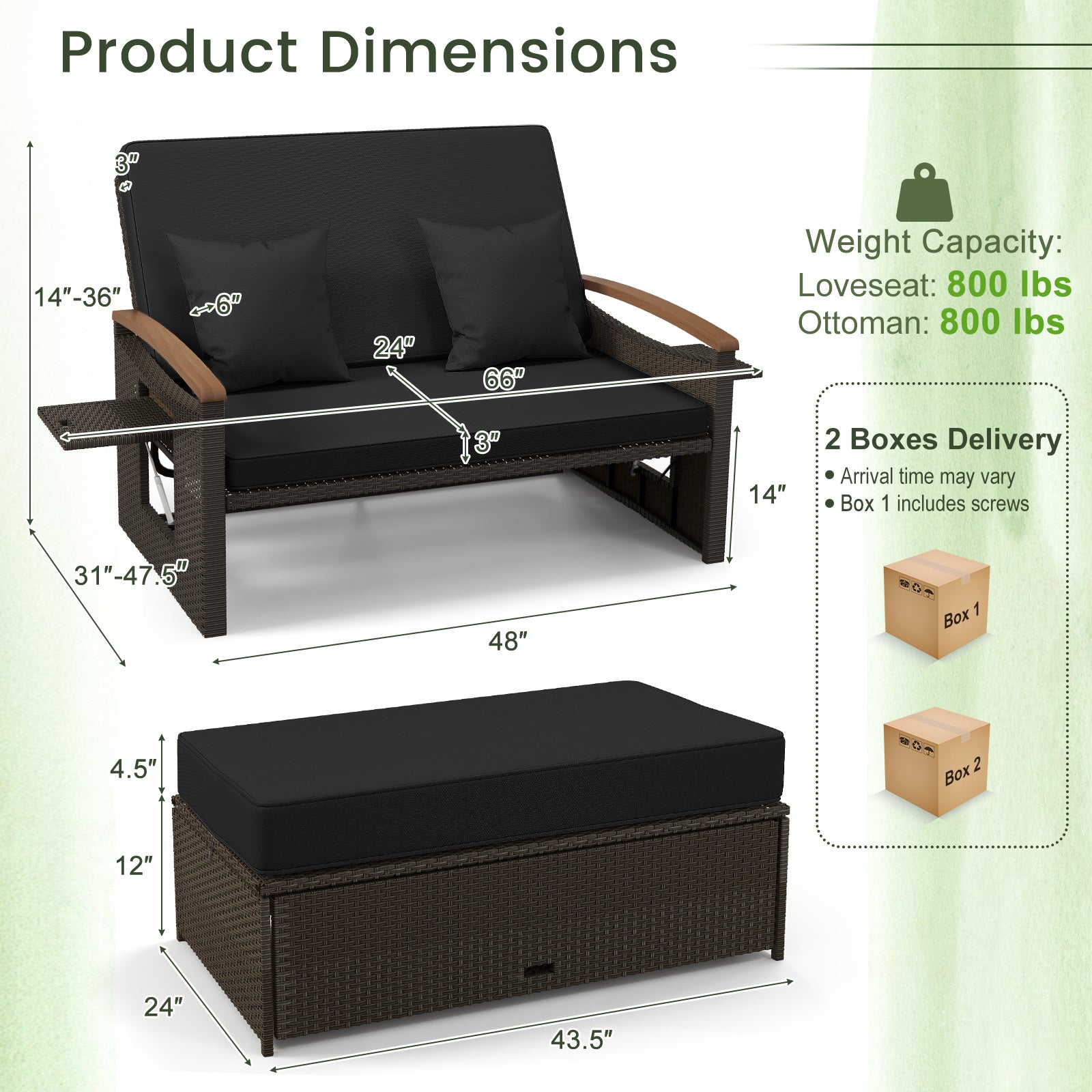 ● Space-Saving Patio Set: The fixed buckle of the ottoman cushion make it always stay in place. And when the ottoman is not in use you can remove the cushion and push the ottoman under the loveseat. Plus the folding side storage panels also save space. Dimension of loveseat: 31"-47.5" x 66" x 14"-36" (L x W x H). Dimension of ottoman: 43.5" x 24" x 12" (L x W x H).