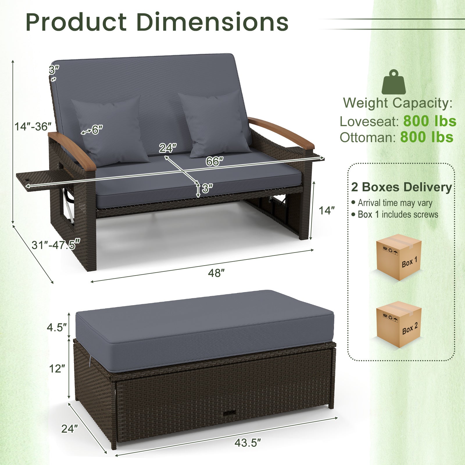 ● Space-Saving Patio Set: The fixed buckle of the ottoman cushion make it always stay in place. And when the ottoman is not in use you can remove the cushion and push the ottoman under the loveseat. Plus the folding side storage panels also save space. Dimension of loveseat: 31"-47.5" x 66" x 14"-36" (L x W x H). Dimension of ottoman: 43.5" x 24" x 12" (L x W x H).