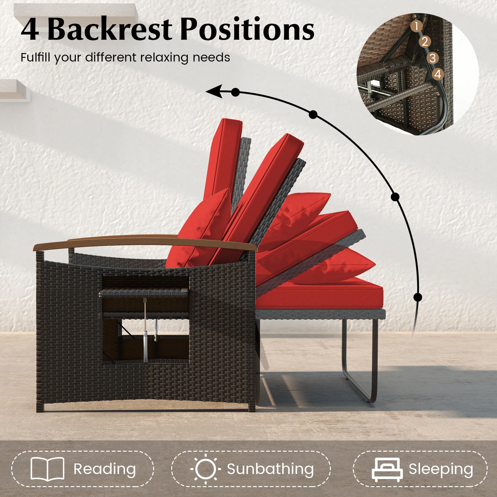 - ● 4-level adjustable backrest positions for ultimate relaxation