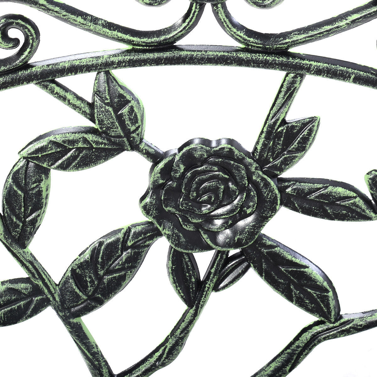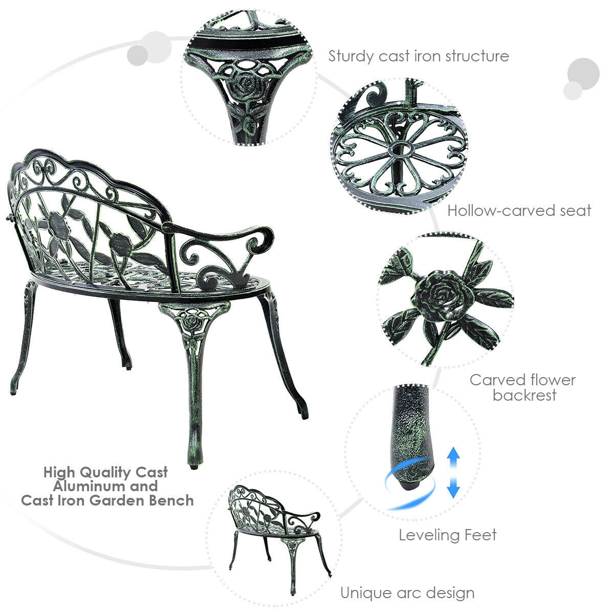 The bench features an antique rose style which is not only an antique piece of garden furniture but also a newly craft. Made of cast aluminum the bench is sturdy and durable.