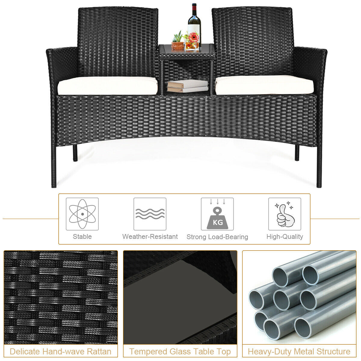 ● Convenient Chat Table: Featuring a chat table between two seats this patio conversation set provides enough space for books and cups while without taking up floor space. Besides the tempered glass table top is fixed by suckers that ensure stability and durability.