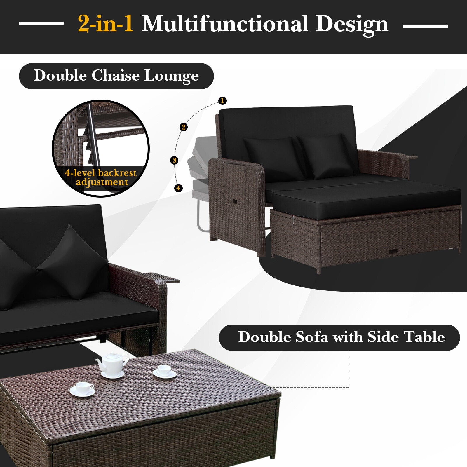 ● 3-in-1 Multifunctional Sofa Set: The combination of the loveseat sofa and ottoman allows you to use this patio set as a double chaise lounge / daybed. 4-level adjustable backrest allows you to sit recline or lie flat for different outdoor activities. And the 2 retractable side trays make drinks and snacks easy to fetch. Moreover when the ottoman cushion is removed you can use this patio set as a double sofa with side table.