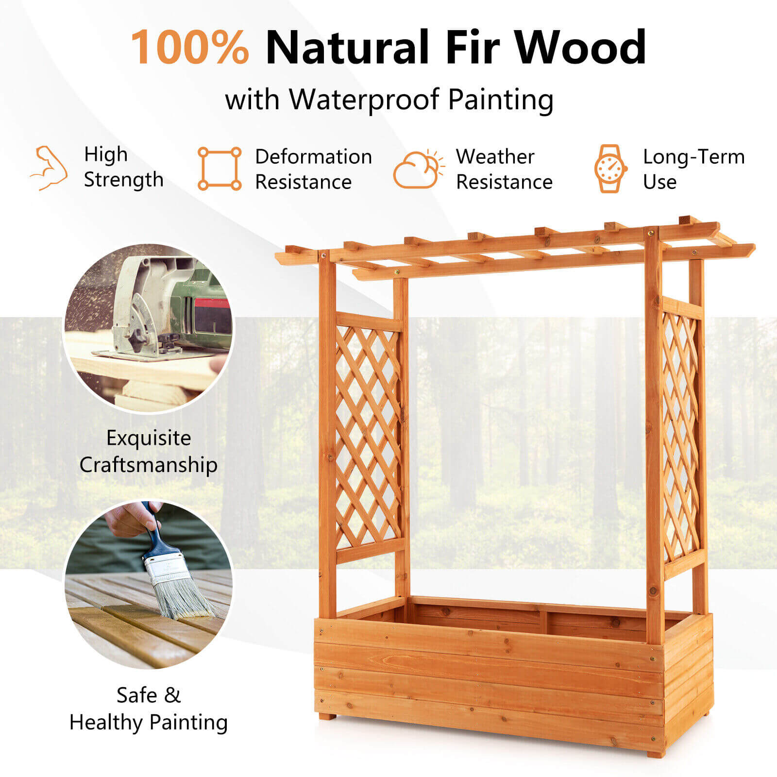 ● Solid Wooden Frame: The raised garden bed with trellis is crafted with 100% natural fir wood and coated with waterproof painting which is characterized by high strength deformation resistance and weather resistance ensuring long-term use. And with delicate craftsmanship the surface is smooth and burr-free.