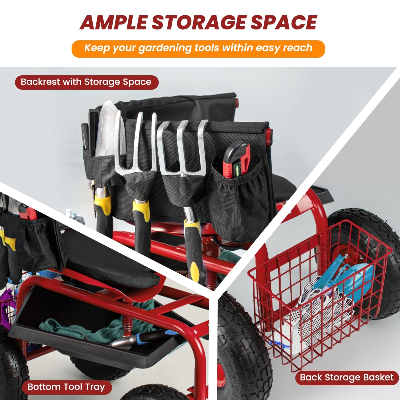 Rolling Garden Cart with Height Adjustable Swivel Seat and Storage Basket-Red