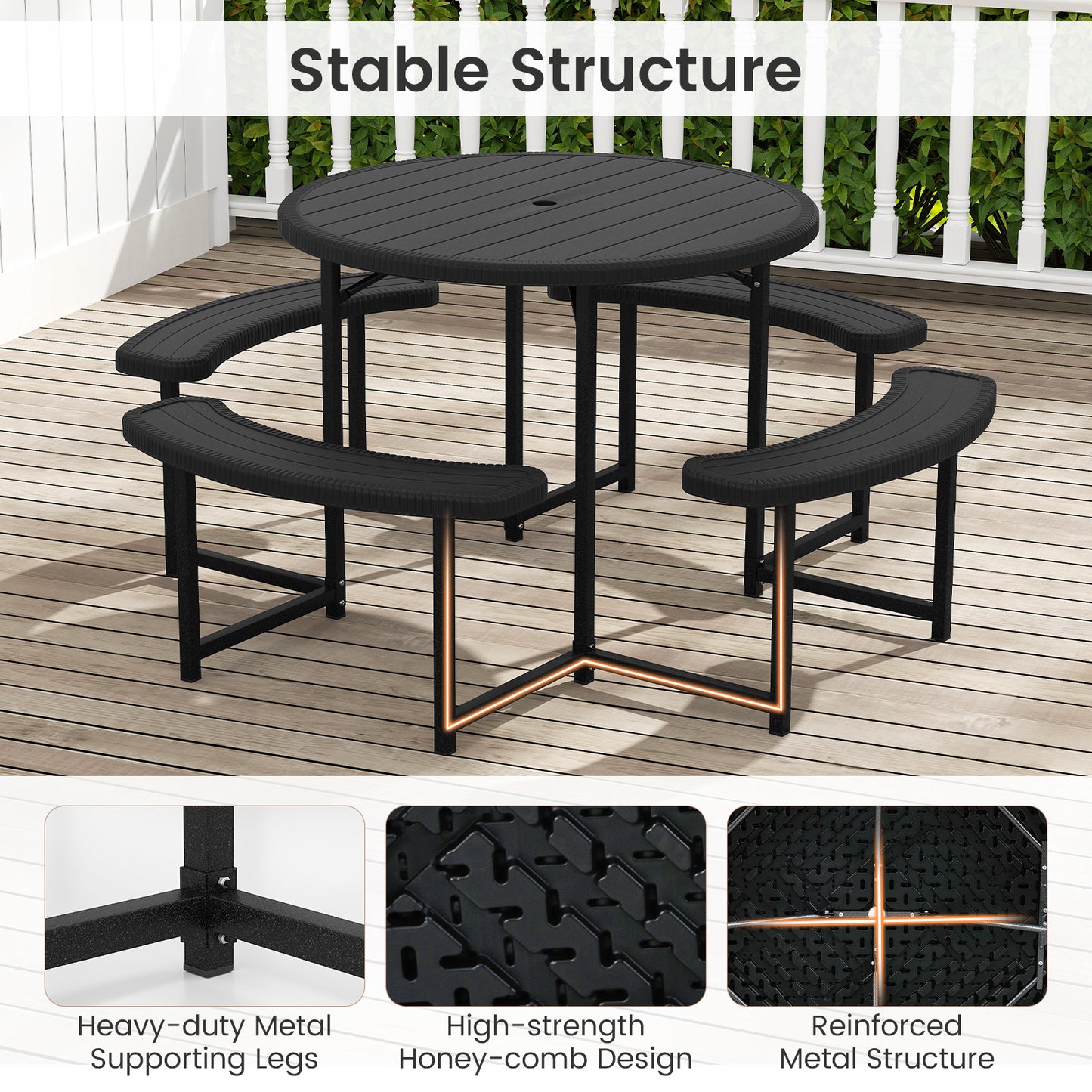 Round Picnic Table Bench Set with 4 Benches and Umbrella Hole for Patio Lawn-Black