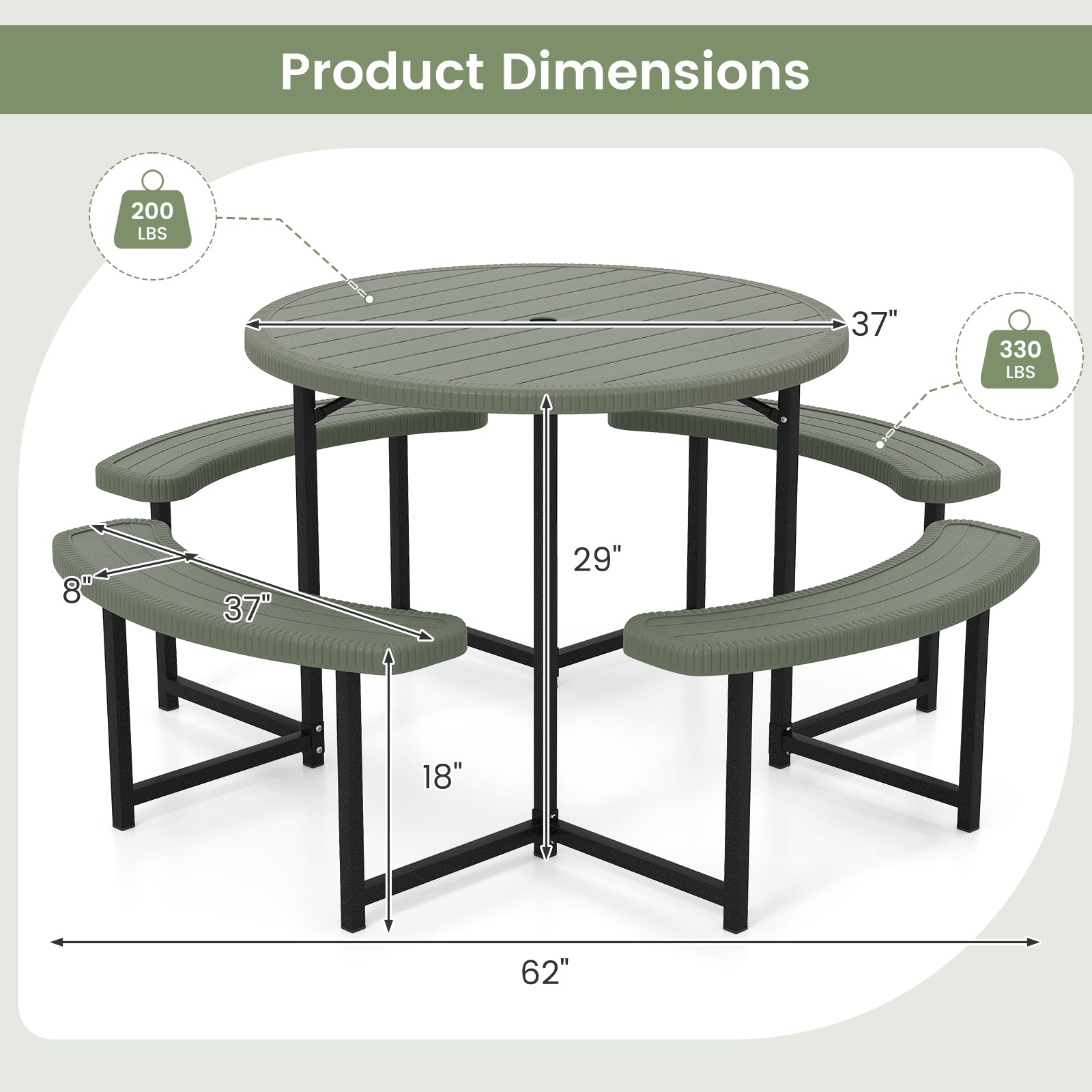 Round Picnic Table Bench Set with 4 Benches and Umbrella Hole for Patio Lawn-Green