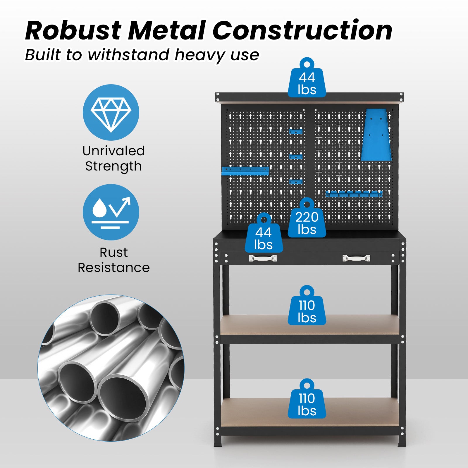 ● Robust Metal Construction: Crafted from high-strength metal frame and premium MDF this workbench is built to withstand heavy use. The plastic sprayed surface adds rust resistance ensuring a long-lasting service life. Furthermore the anti-slip footpads protect your floor from scratches.