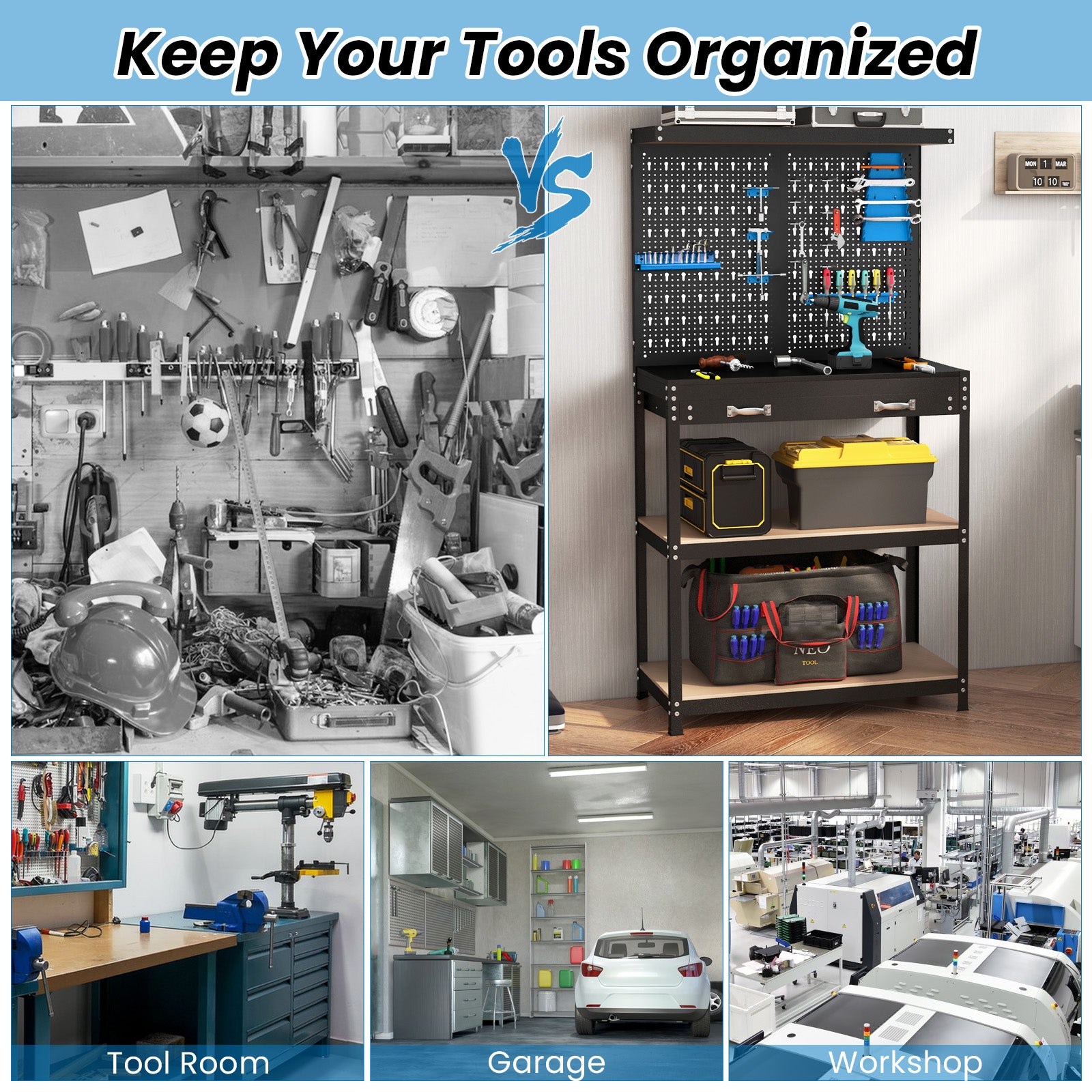 ● Versatile Storage Solution: This workbench offers a variety of storage options including a top shelf 2 pegboards a spacious tabletop 2 drawers and 2 open shelves. These compartments provide organized storage space for a range of items such as cordless drills spanners screwdrivers and toolboxes.