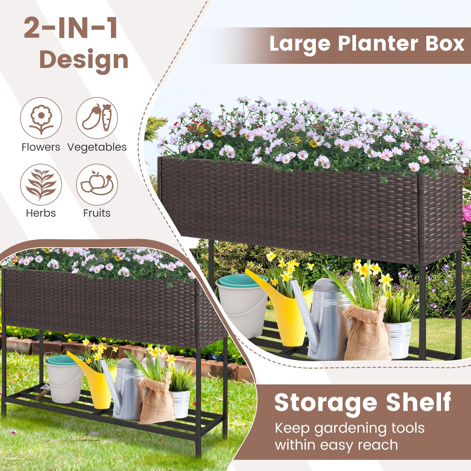 Wicker Raised Garden Bed with Storage Shelf and Drainage Gaps for Flowers