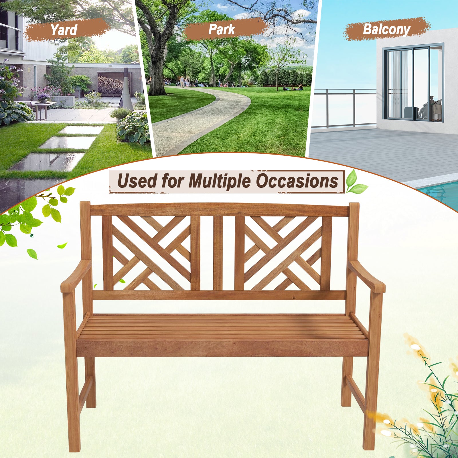 ● Selected Acacia Wood: The love seat bench is constructed of top-grade acacia wood which is natural well crafted abrasion resistant and durable. Therefore the thoughtful material selection ensures prolonged serving time.