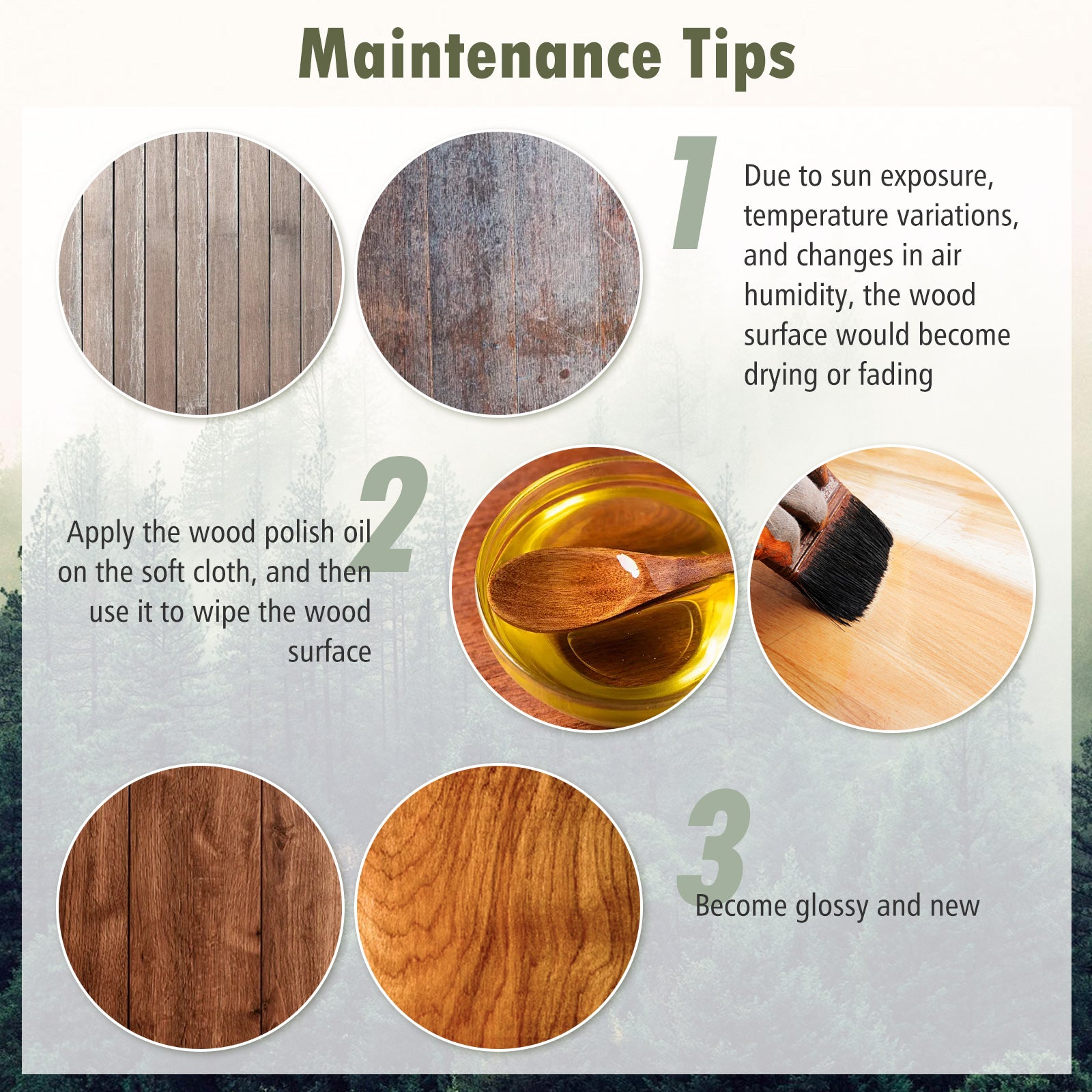 ● Oil Coating and Maintenance Tips: The wooden surface is coated with waterproof teak oil finish providing an additional protective layer to outdoor elements. Besides due to sun exposure temperature variations and changes in air humidity the wood surface would become drying or fading. Apply the wood polish oil on the soft cloth and then use it to wipe the wood surface. It could become glossy and new.