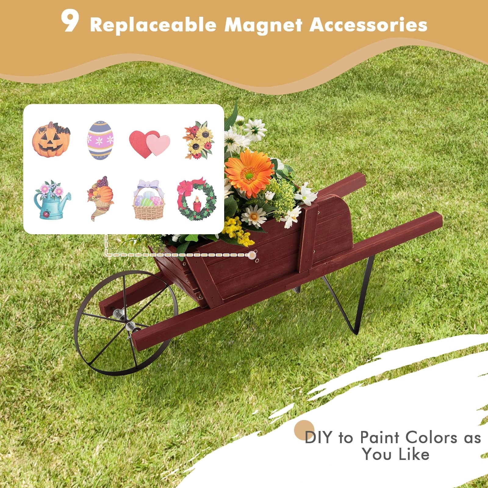Wooden Wagon Planter with 9 Magnetic Accessories for Garden Yard-Red